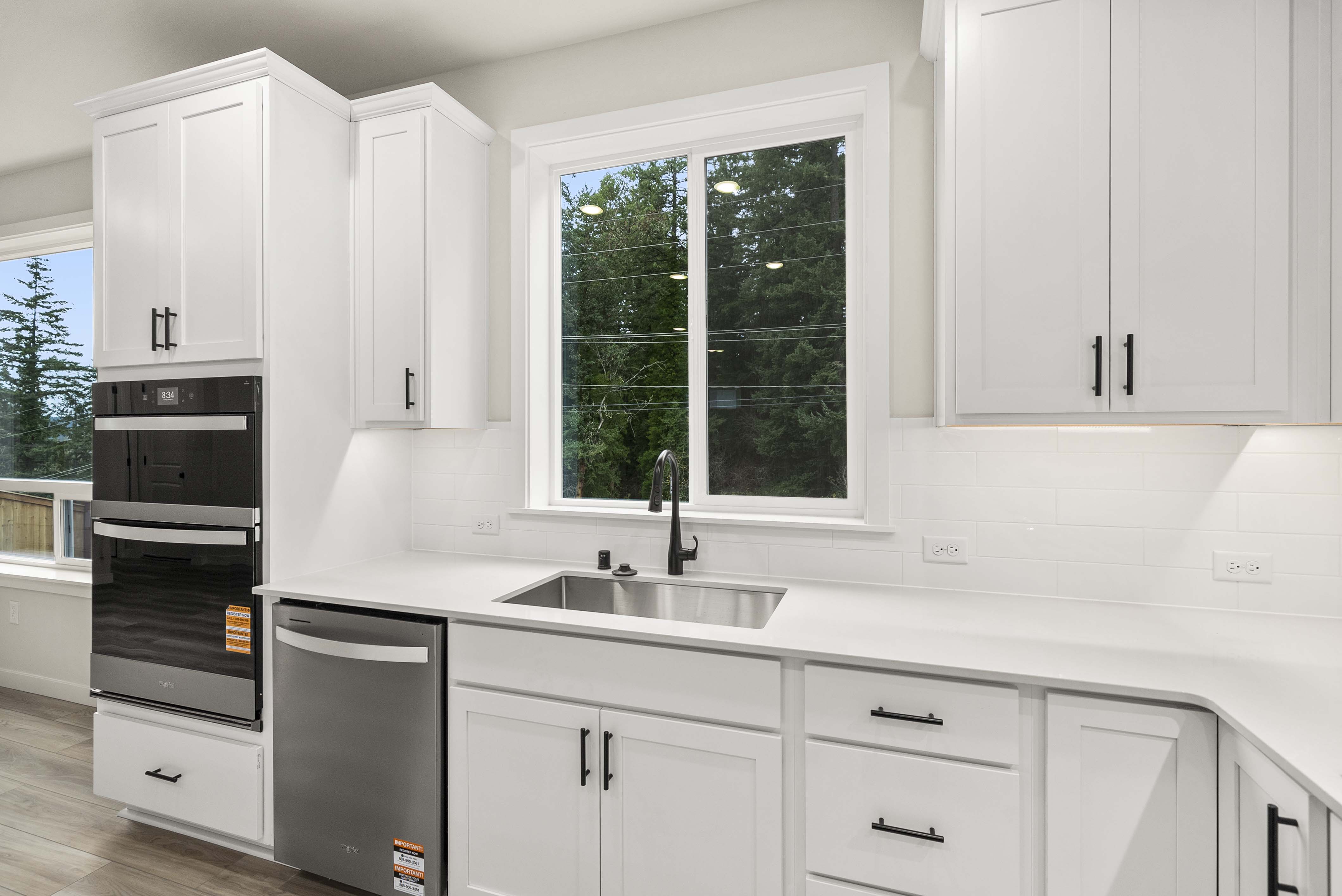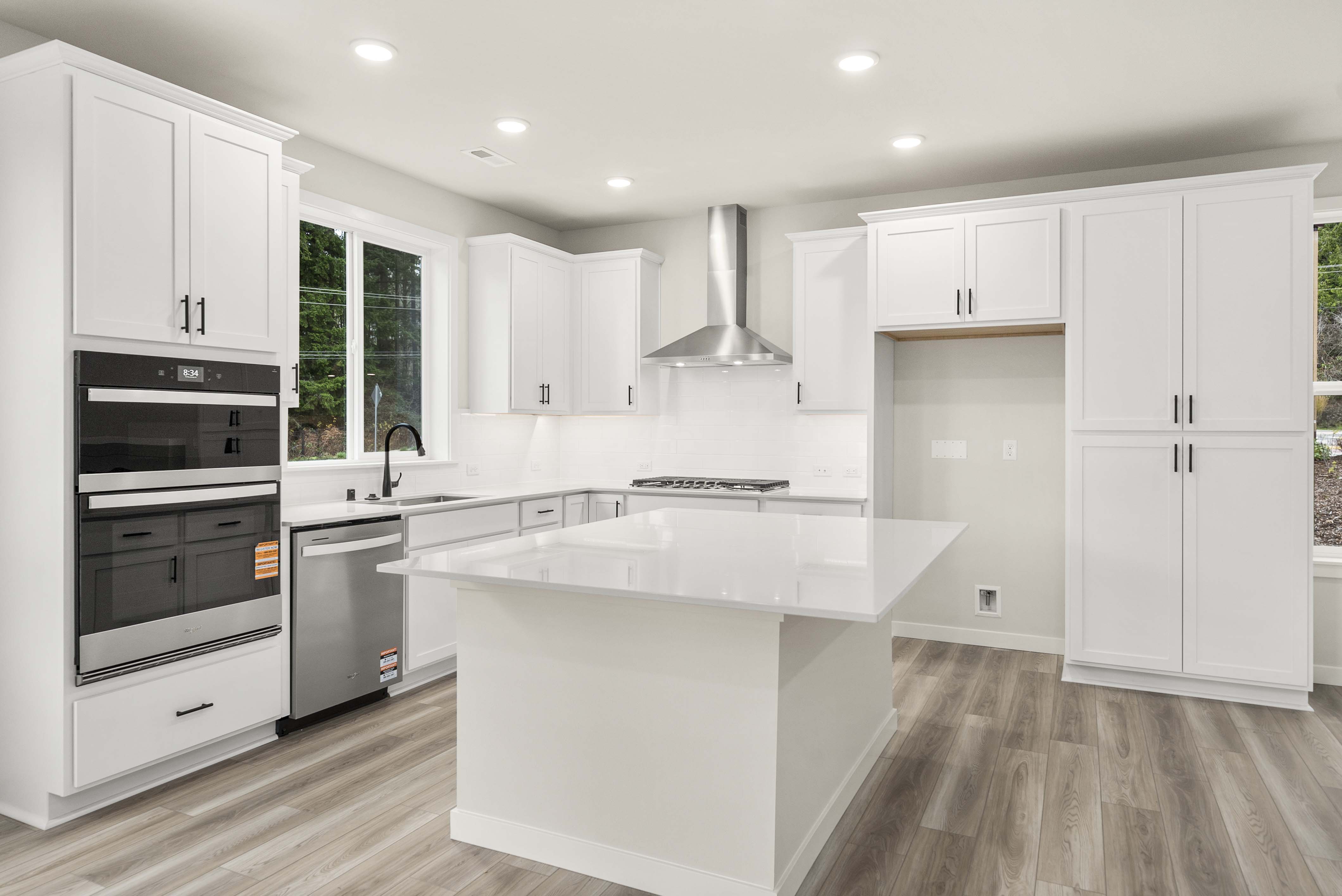 Showcasing thoughtfully designed two-story floor plans, these homes highlight modern features that blend comfort and innovation. Enjoy stylish quartz countertops in the kitchen and primary suite, premium stainless-steel appliances—including a electric cooktop with a 36” wall-mount range hood and smart Wi-Fi oven/microwave combo—plus 34.5-inch cabinets with molding, soft-close doors, pulls, and under-cabinet lighting.