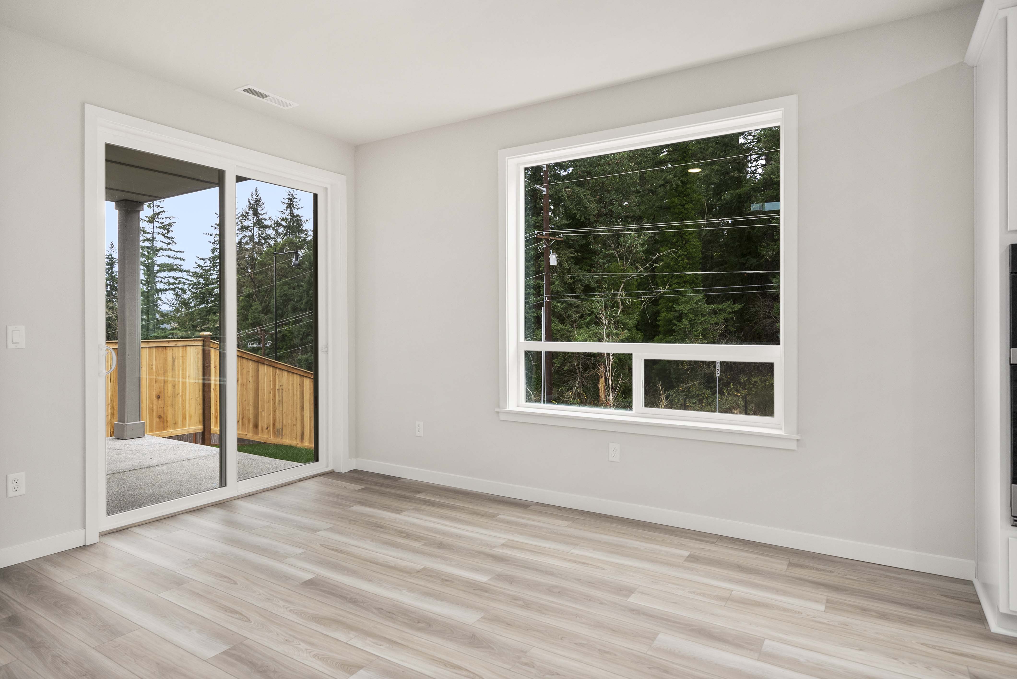 Additional included features like two-bay garages, 9’ ceilings on the main floor, luxury vinyl plank flooring, Ecobee® Premium Pro thermostats, and Schlage® electronic front door locks elevate everyday living. Select homesites also offer optional covered patios and open railings for added comfort and style.